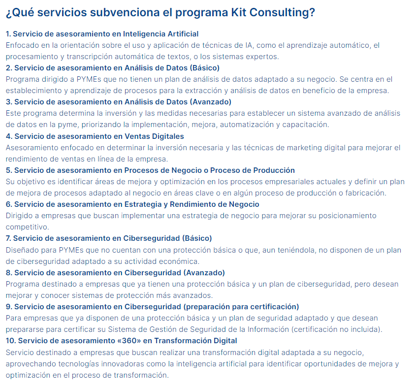 Los servicios de asesoramiento que proporciona el programa Kit Consulting están orientados a las pequeñas y medianas empresas de entre 10 y menos de 250 empleados.
